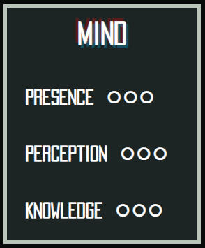 - Presence is a measure of a character’s personality and the impression they have on others. It isn’t strictly about smooth-talking charisma, either. A beautiful dancer, a snake-oil salesman, or brutish brawler all make use of Presence – whether it be to seduce, persuade, or intimidate. It is about the force of will – and how one interacts with others.- Perception measures one’s ability to notice things or gather information quickly and at a glance. One may easily read a room, put together a crime scene, or see unknown entities in the dark if they’re careful with their senses. Perception won’t tell you things you can’t see, hear, or feel.- Knowledge measures how much a character may know about a particular topic or field. It is not strictly about one’s level of education – it can also encompass street smarts, trivia, or odd facts about one thing or another. If there’s something to be known, Knowledge can cover it.