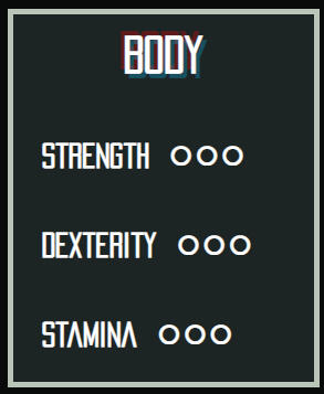 - Strength describes the physical power of a character. Their ability to lift heavy objects, themselves, or deliver physical blows with fists or melee weapons.- Dexterity describes the control a character has over their movements, encompassing speed and precision. Their ability to dodge attacks, sneak around, or do complex maneuvers with their body with ease.-Stamina describes how a character’s body may perform under pressure. How they may be able resist or fight off disease, endure long stretches of strenuous activity, or how they react to injury. Broadly, it will also determine a character’s hit points.